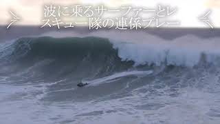 大波に乗るサーファーとレスキュー隊との連係プレー