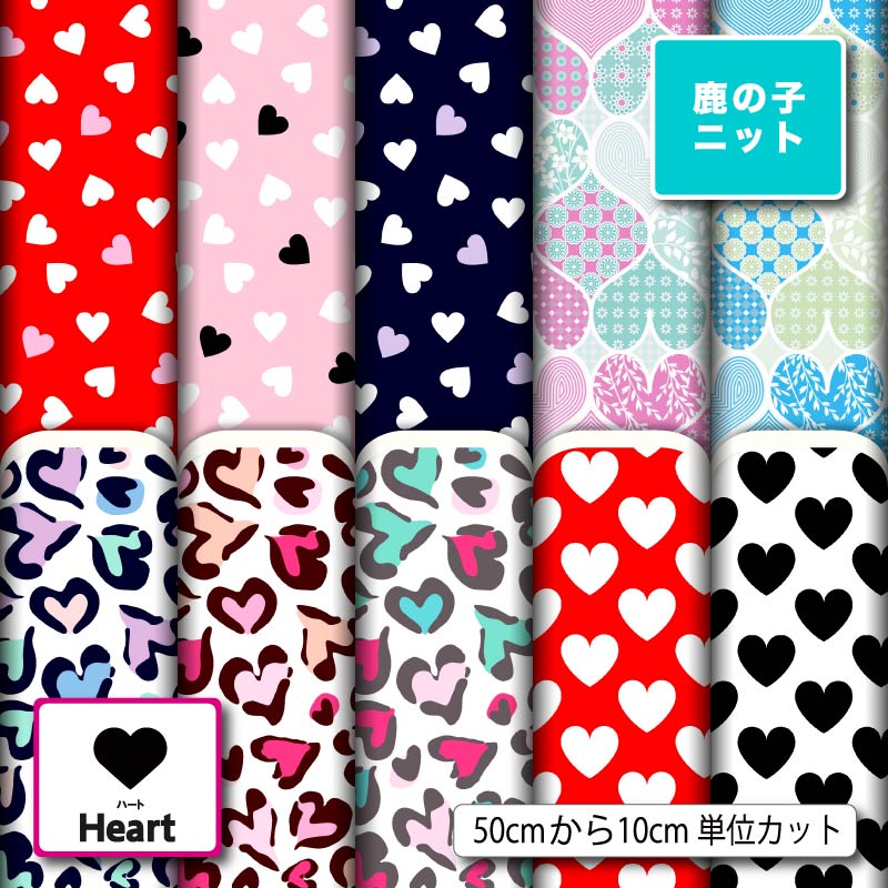 【総柄プリント生地 鹿の子ニット生地】 組成:ポリエステル100% プリント巾(有効巾):151cm、生地巾:160cm 【当店のプリント生地特徴】 ハート柄 小さい柄 スイート ハート ミニ プチ ハート ヒョウ柄 レオパード柄 かわいい 可愛い 女の子 スウィートハート スウィートハート キュー