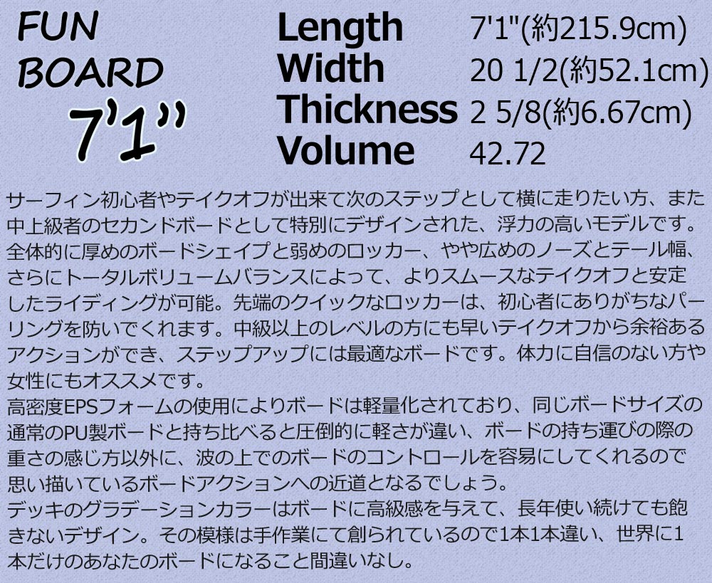 LAHAINA 7'1 L13 サイズ 7'1"(約215.9cm)*20 1/2(約52.1cm)*2 5/8(約6.67cm) CL値/重量:約42.72/約3.54kg 【適応体重(目安)】 初中級:〜65kg、中上級者:〜75kg 商品説明 ◆ボトム形状:シングル〜ダブルコンケープ ◆レール形状:やや厚め ◆テール:スカッシュテール ◆ロッカー:やや弱め ◆仕上げ:ポリッシュ 【注意】 ブラシまたはティントカラーのボードは手作業にて仕上げておりますので、それぞれ色の濃さが違う場合がございます。
