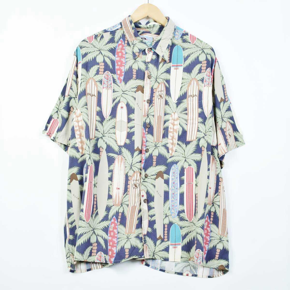 80〜90年代 レインスプーナー REYNSPOONER ダイヤモンドヘッドタグ 総柄 サーフボード柄 ヤシの木柄 レーヨン ハワイアンアロハシャツ ハワイ製 メンズXL ヴィンテージ /eaa037584 【中古】 【200518】【JS2010】
