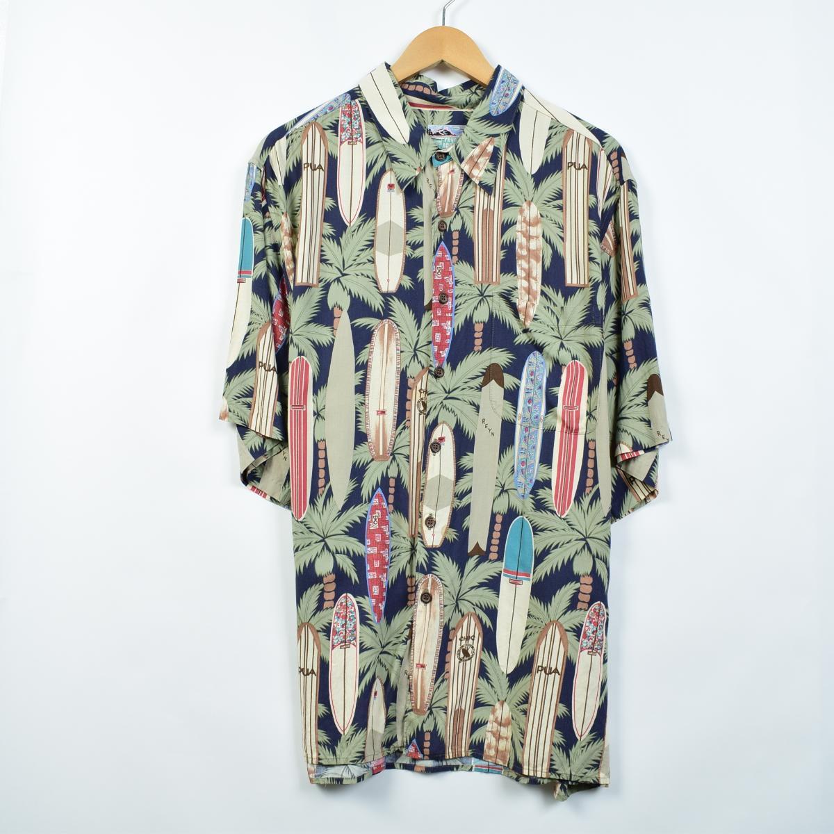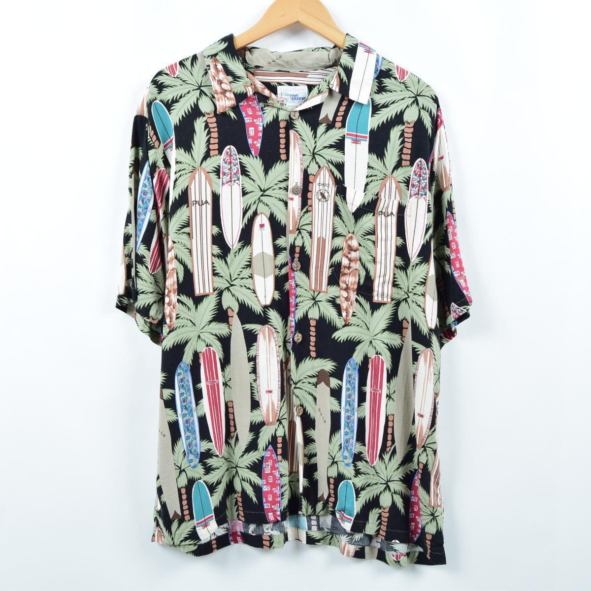 80~90年代 レインスプーナー REYNSPOONER ダイヤモンドヘッドタグ 総柄 ヤシの木柄 サーフボード柄 レーヨン ハワイアンアロハシャツ ハワイ製 メンズL ヴィンテージ /eaa025971 【中古】 【200418】【JS2010】