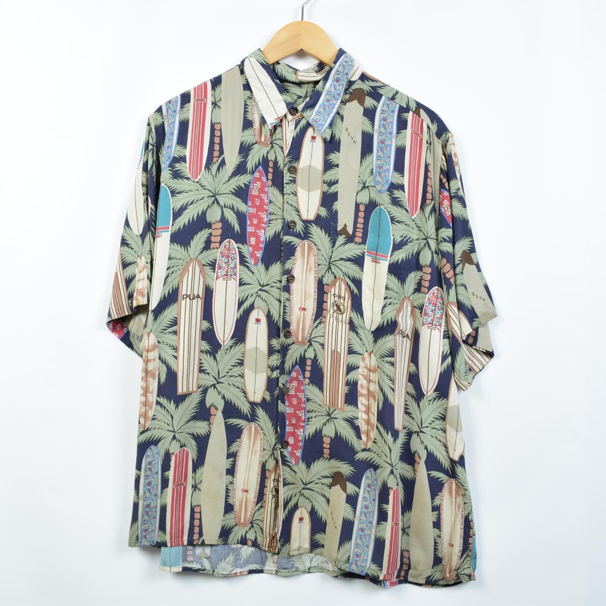 80~90年代 レインスプーナー REYNSPOONER ダイヤモンドヘッドタグ 総柄 ヤシの木柄 サーフボード柄 レーヨン ハワイアンアロハシャツ ハワイ製 メンズXL ヴィンテージ /eaa026262 【中古】 【200502】【JS2010】