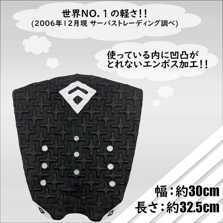 幅を調節できるので、FISH系や幅広いボトムにも対応! 世界NO.1の軽さ!!(2006年12月現 サーパストレーディング調べ) デッキパッチのシール面はハイグレードの接着シートを採用。